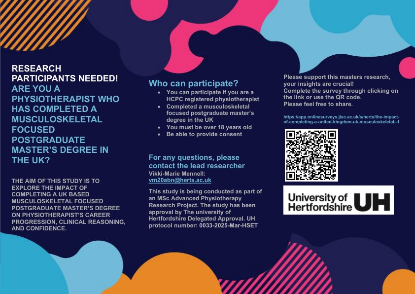 Research Participants needed - ARE YOU A HCPC REGISTERED PHYSIOTHERAPIST WHO HAS COMPLETED A MUSCULOSKELETAL FOCUSED POSTGRADUATE MASTER’S DEGREE IN THE UK?